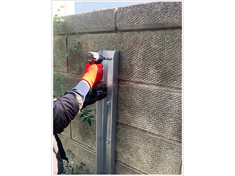 コンクリートブロック塀用の耐震補強金具「FITパワー」を用いた改修工事の様子です。
